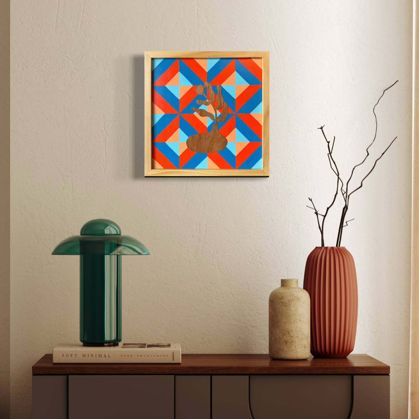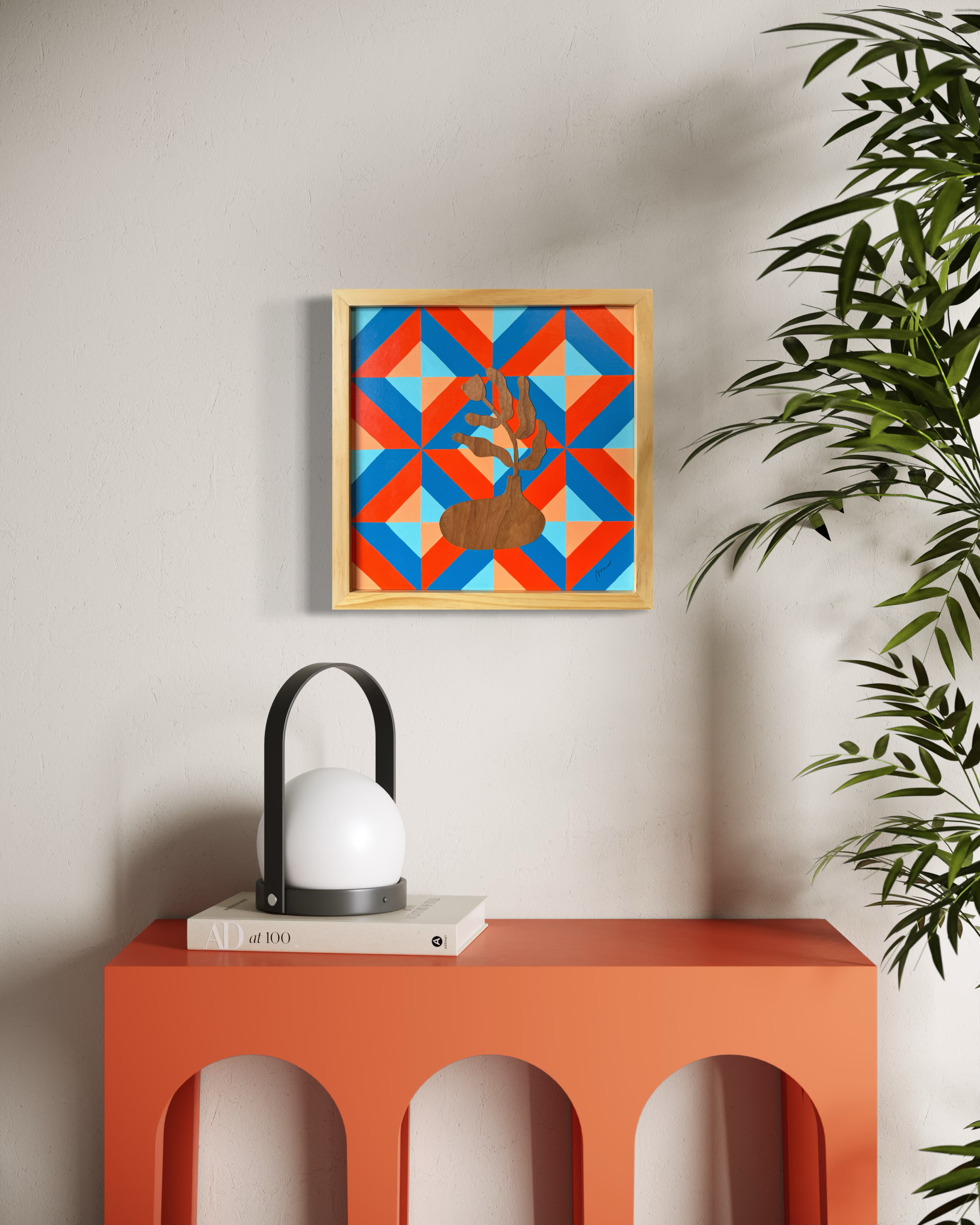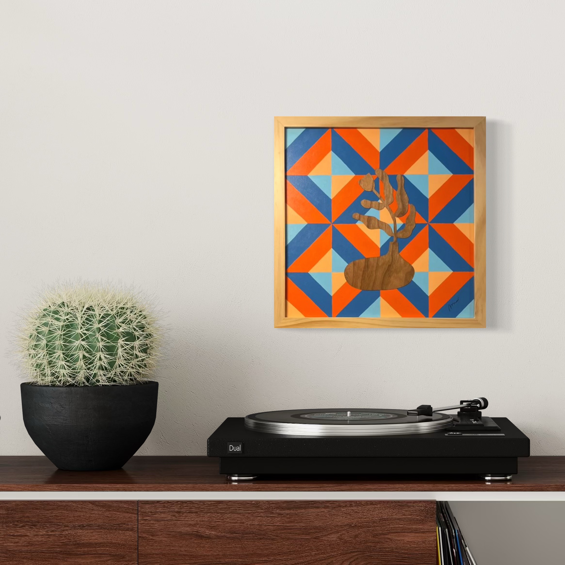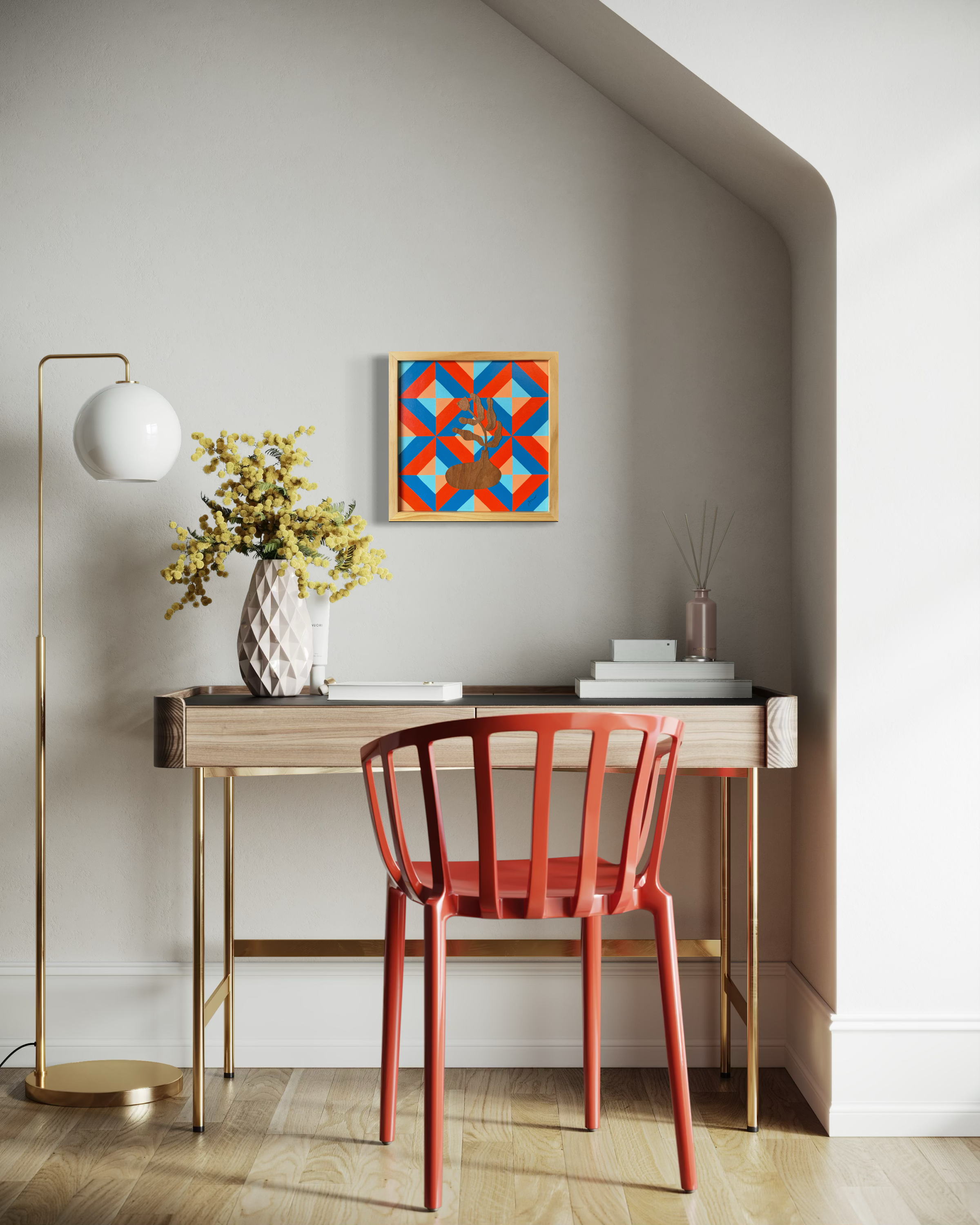 Flower figure is wood veneer cut out and permanently attached to the acrylic painting background. Artwork comes with ready to hang 13×13 inch wooden frame. Varnished, signed and dated.