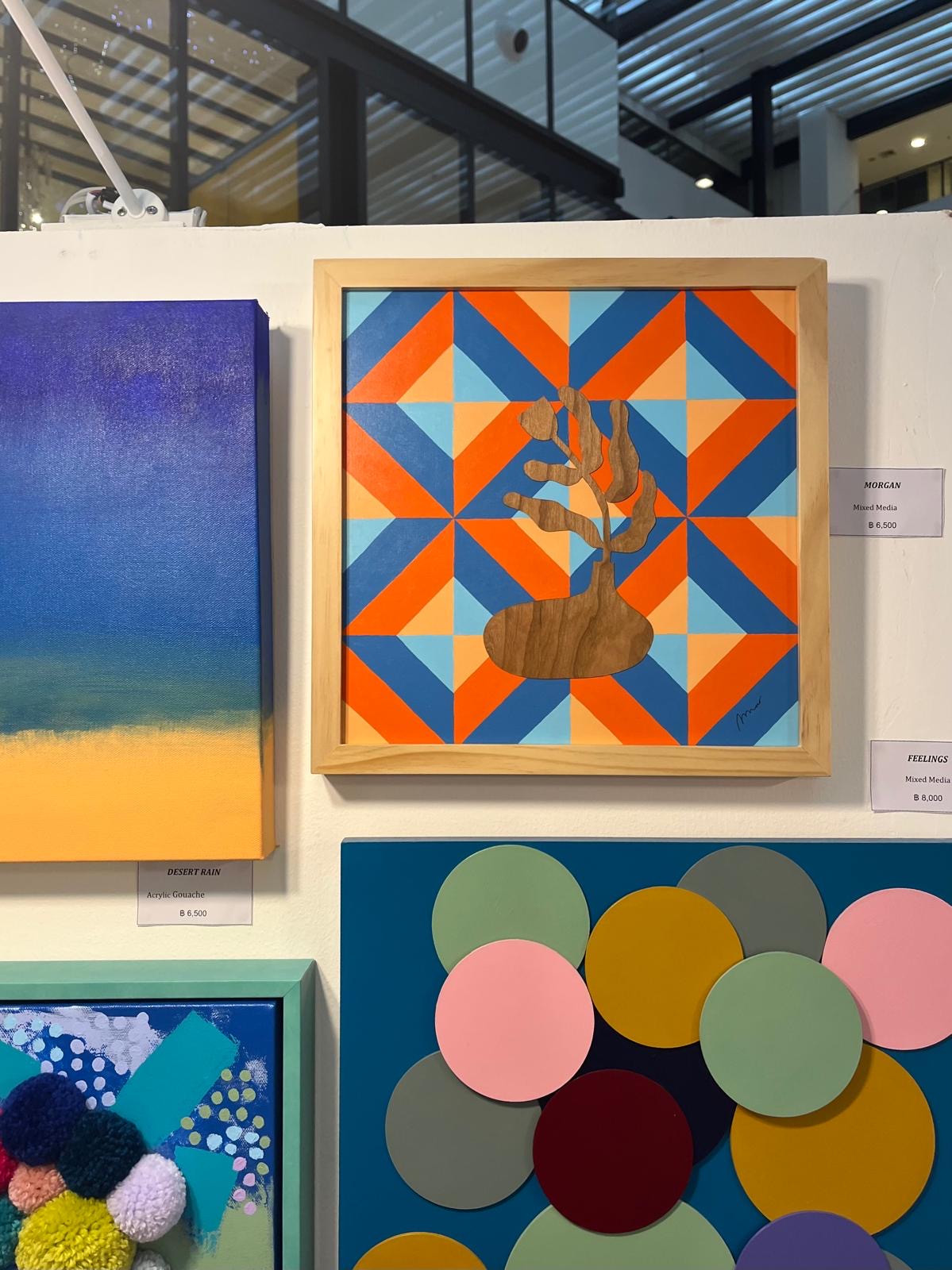 Flower figure is wood veneer cut out and permanently attached to the acrylic painting background. Artwork comes with ready to hang 13×13 inch wooden frame. Varnished, signed and dated.